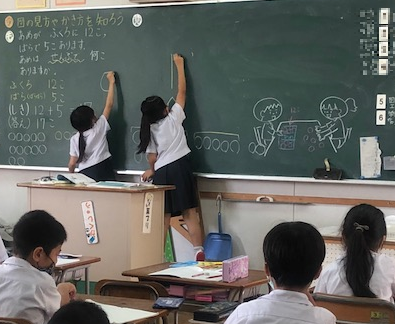 黒板前に出てきた子どもたちは、自分たちの考え方をみんなに披露します。