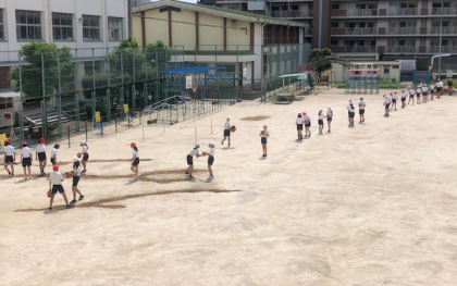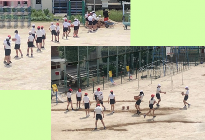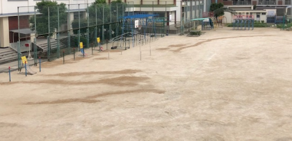 先日までの長い雨により、島屋小学校の運動場も、その水の流れで溝ができる程になっていました。そこで、山土を盛っていた学習園横から、地面が削れたところまで列をつくり、土を運ぶためのバケツリレーが行われていたのでした。