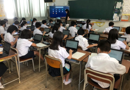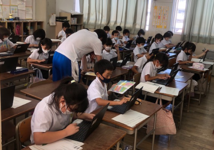 3年3組の6時間目。子どもたちはパソコンを前に奮闘しています。みんなが「ジャムボード」というアプリを使い、2学期のめあてを作っていました。