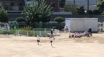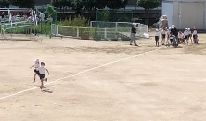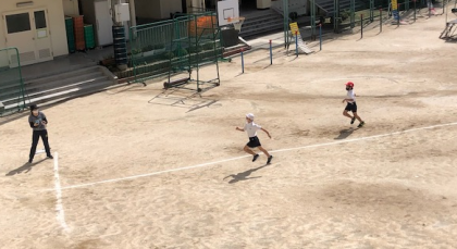 2時間目。1年1組・2組が運動場でかけっこの練習です。
