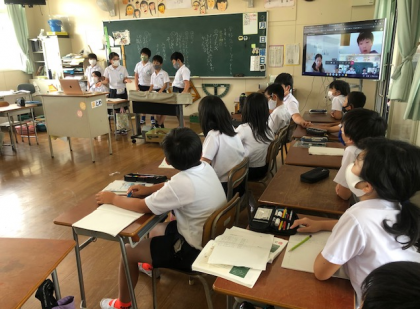 「学校について、紹介することを考えよう」をテーマに意見を出し合っていました。教室に居ない子どもたちも、画面から参加です。
