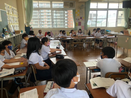 4年2組の3時間目。子どもたちが机をコの字型にし、話し合い活動をしています。