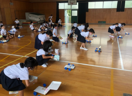 風をちゃんと受けるように工夫された車を、息を吹きかけたり、もので扇いだりして走らせます。一列に並んで、競争もしてみました。