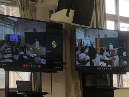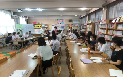 5時間目。1年3組は国語の時間です。少数の先生が教室で、そして他の先生は蜜を避けるため多目的室でのリモートで、今年度初めての研究授業を行いました。放課後に、外部から先生も来ていただき、討議会です。