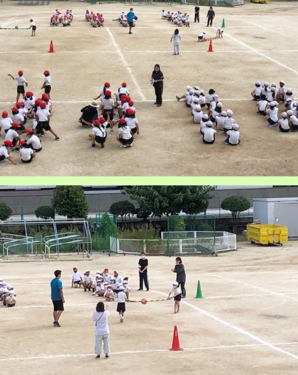 真ん中に三角コーンを置いて、子どもたちは半分ずつに分かれて座っています。