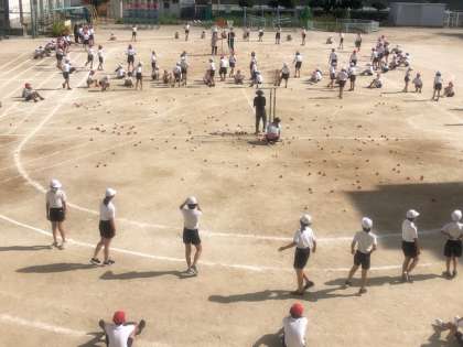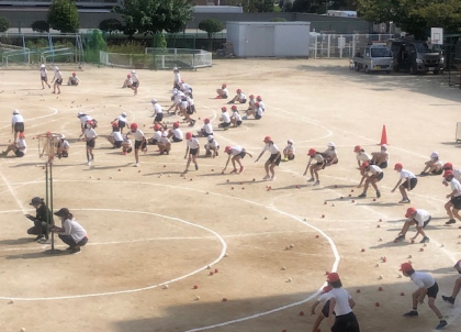 団体競技は玉入れ。しかし、しかしその様子は一風変わっていました。なんと、子どもたちは後ろ向きになって、かごめがけて玉を投げています。