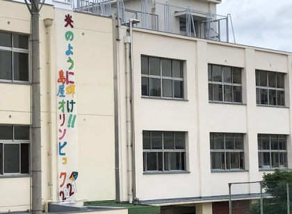 玄関の立て看板や屋上からのスローガンが、子どもたちを待ち受けます。