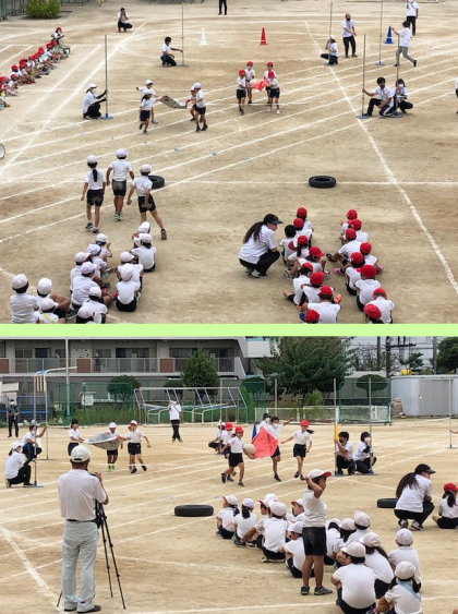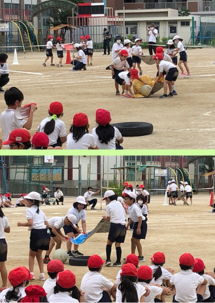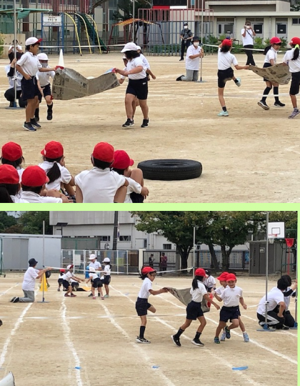 2年生の団体競技は、ボール運びです。新聞紙で作ったじゅうたんにボールを乗せ、4人が四隅を持ってぐるっと一回り。途中、ゴムが張られた難関な場所をまたぎ越さねばなりません。魔法がかかったじゅうたんだと、ボールを乗せて運んでも、最後まで落ちないけれど…さて。