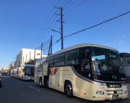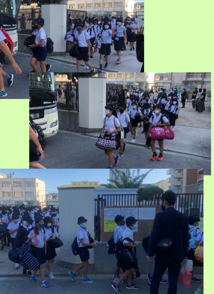 保護者の方々、教職員が、元気に無事に楽しんでくることを祈って見守る4台のバスが、学校を後にしました。
