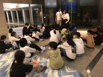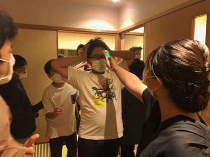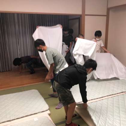 夕食後、寝具係に布団の敷き方を伝えて、布団の用意をしていました。合わせて、各部屋を先生たちが回って検温です。