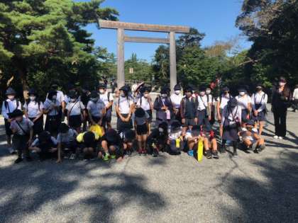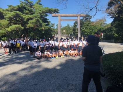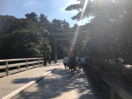 伊勢神宮に到着しました。雲一つない晴天で、宇治橋の所で集合写真を撮りました。