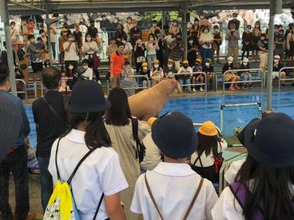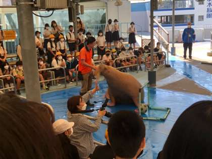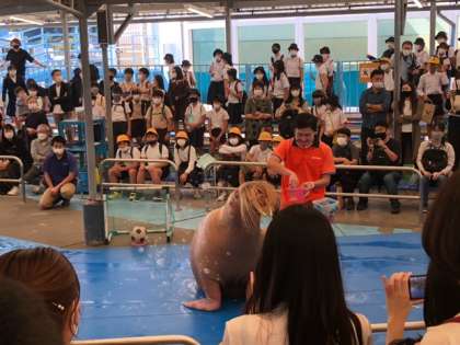 セイウチのショーを間近で見ました。セイウチの投げキッスや、サッカーのフリーキックは、みんなの笑いを誘いました。