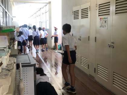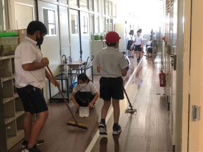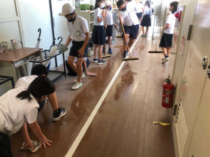6年生の教室のある校舎は運動場に面した4階です。3階の5年1組の子どもたちは、今日の掃除の時間に、自分たちの教室や廊下を掃除するのと一緒に、6年生の教室前廊下の掃除も行いました。