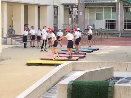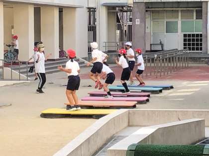 4年4組の子どもたちがなわとびのなわを手に、踏み台の上で思いっきり飛び上がっていました。