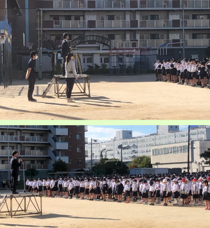 修学旅行の行程や、6年生がマナーよく立派な態度で臨んでいたことを下級生の子どもたちに伝えられました。