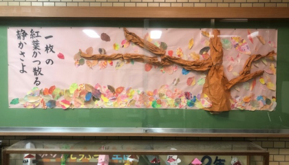 本校では、玄関の壁の大きなガラスの展示ケースに、担当の学年の先生たちで制作した季節のモチーフを月替わりで飾っています。今回は紅葉した木。4年生の先生たちが担当しました。