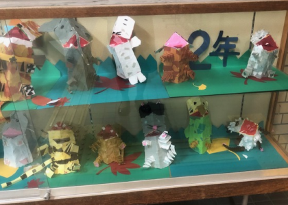 玄関の展示には、もう一つ、壁から目を下ろしたショーケースに、児童の作品があります。