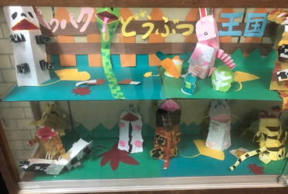 「パクパク動物王国」と題された作品は、牛乳パックに色の紙を貼り合わせて作った動物です。紙は二色使うこと、牛乳パックの角の所に切り目を入れてパクパクした口を作ることを条件に子どもたちは取り組みました。