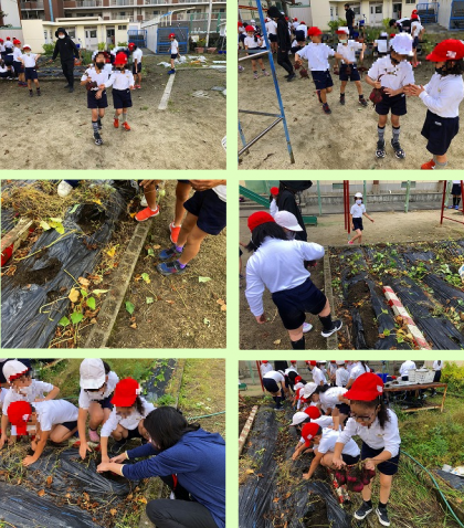 クラスごとに学習園に集まって、楽しい「いもほり」の時間です。