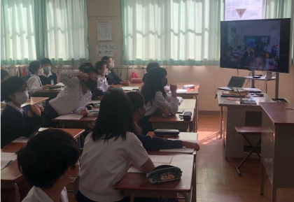 6年2組のプレゼンテーションの様子をリモートで見る6年1組の子どもたち。自分たちとはどこが違うかな、興味津々です。