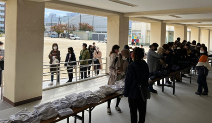 土曜授業で子どもたちが帰った12時から、PTAの取り組みとして、ピロティにおいて「制服リサイクル」が行われました。