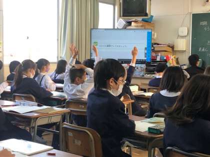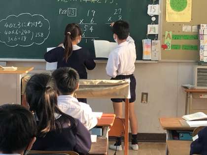 子どもたちは積極的に手を挙げて、しっかり九九を使って問題を解いていきます。
