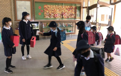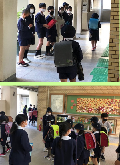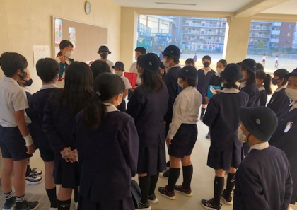 運営・代表委員の子どもたちが朝一番にピロティに集合し、そこから募金箱を持って各所に散らばります。