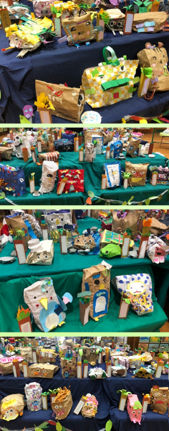 1年生は、「かみぶくろから うまれたよ」のタイトルで、立体作品を制作しました。