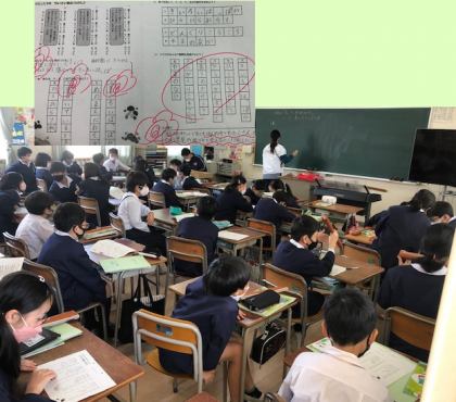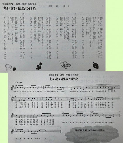 先日、子どもたちは、自分たちの小さい秋を見つけ、それを、8,7,8,5文字にして歌詞を考えました。