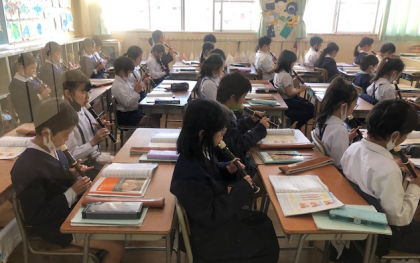 6時間目の4年4組の教室から笛の音色が聞こえてきます。