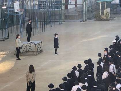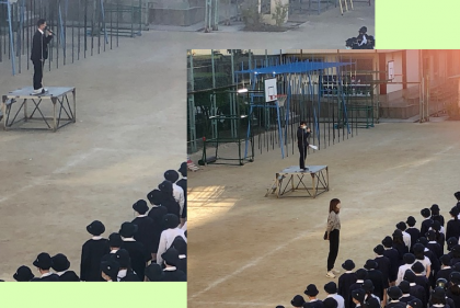 児童代表が、校長先生の前に出て「おはようございます」のあいさつのあと、校長先生からのお話です。