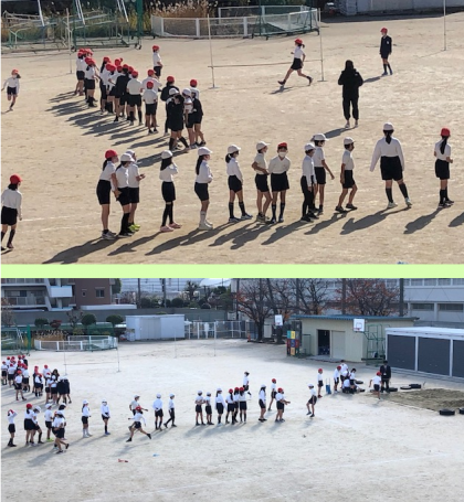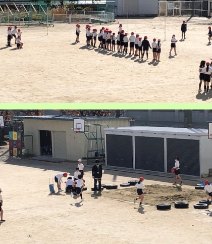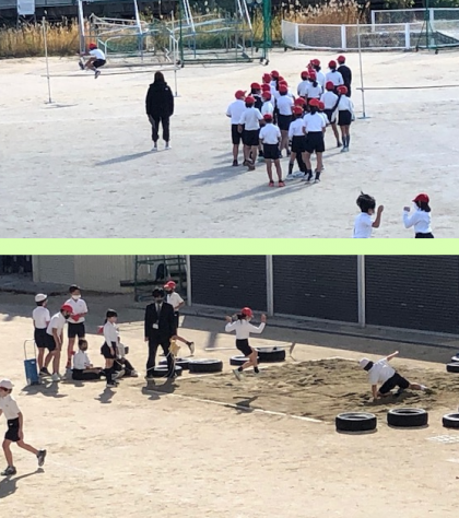 4時間目の運動場では、4年3組と4組が、体育の学習をしています。片や、砂場に向かって飛び込む走り幅跳びをし、片や、二本の支柱にかけたバーを飛び越さんと走り高跳びをしています。