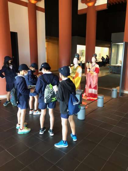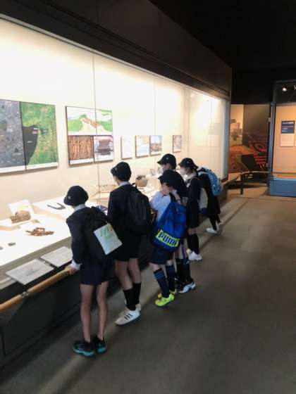 エレベーターで上の階まで一気に上がります。10、9、8、7階までが展示フロアになっています。子ども達は班ごとに見学します。昔の大阪に関する資料や写真などの展示物が数多く紹介されています。