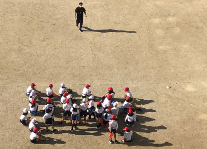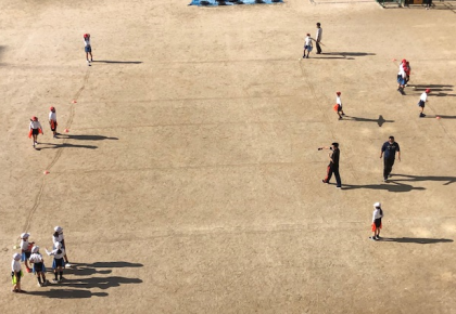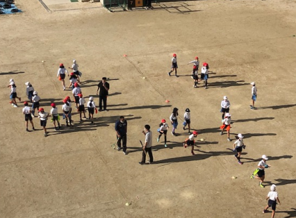 運動場いっぱいにコートを2面取って、4年2組の子どもたちが、腰にカラフルな布をつけて球技を始めるところでした。