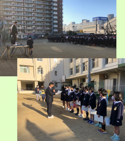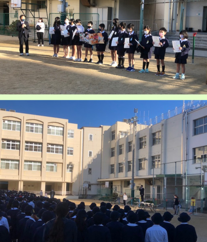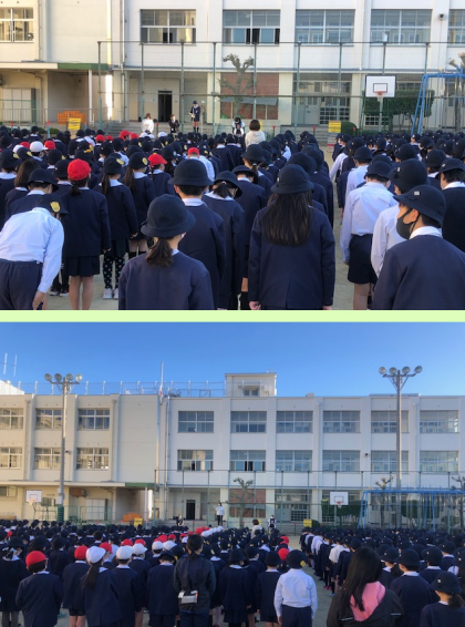 朝礼台の前に並んで、みんなから拍手をもらいました。