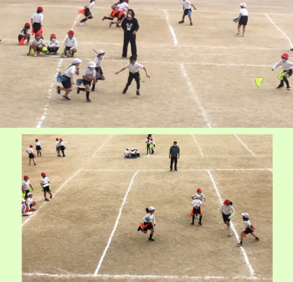 腰に付けたフラッグを、一番向こうの線まで運べたら、点数が高いそうです。作戦を考えて、フラッグを取られないで突破しようと頑張ります。
