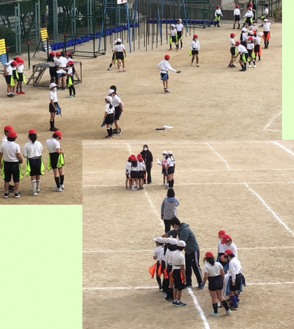 5時間目。3年1・2組の体育の学習です。運動場いっぱいにコートを描いて、フラッグフットボールをしました。