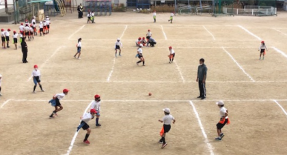 試合をするのは初めての子どもたちです。攻守に分かれて動くのも、戸惑いながらです。