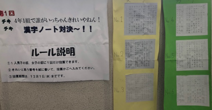 ろうかには、きれいに漢字ノートが書けているか、友だちのノートを見て評価する取り組み結果が貼りだされていました。