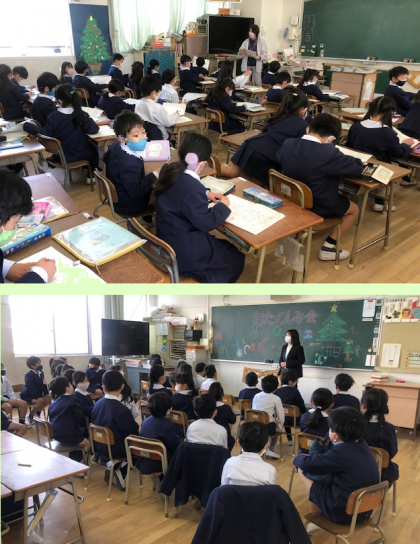 2年1組さんの黒板にも、先生が描いたお楽しみ会の文字。今から始まるようでした。