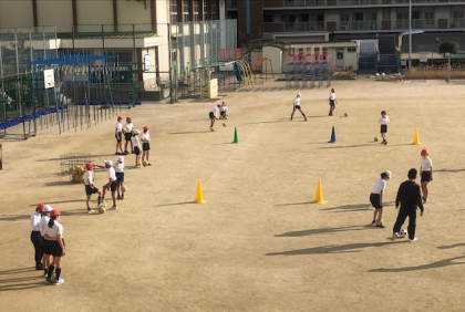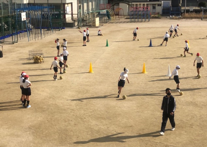 この後、ボールを蹴りながらトラックの周りをまわり、ドリブルが上手くなったところで、全員が今度はトラックの中に入り、自分のボールをキープしながら、他の人のボールをコート外に蹴り出してアウトにさせる、というゲームをしたそうです。なかなか面白くてとっても盛り上がったそうです。