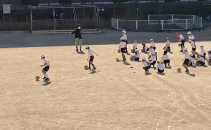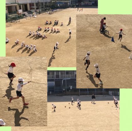運動場で元気に活動しているのは、1年生1組と2組です。