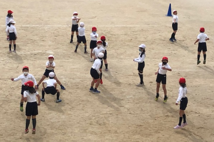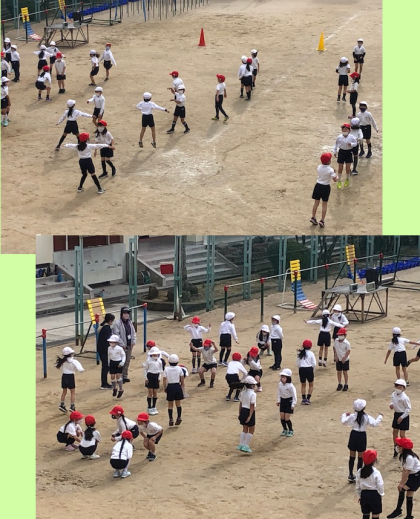 2時間目に1年1組と2組、3時間目に1年3組が、運動場で体育の学習です。