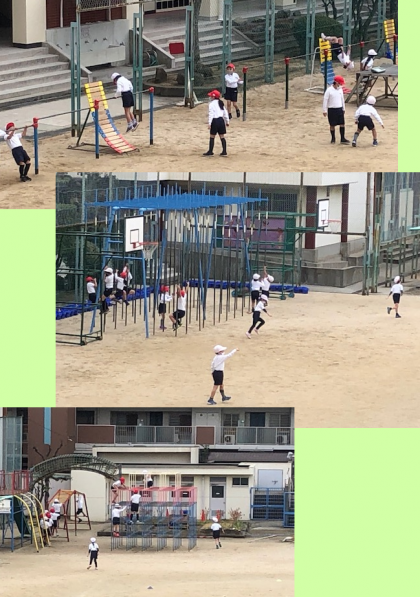 3組は、3つに分かれて鉄棒や遊具に取り組んでいるところでした。やはり1年生。遊具で遊ぶのが大好きです。