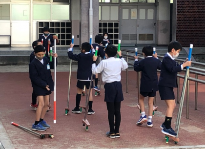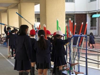 PTAの皆さんが、各ご家庭で協力いただいたベルマークを、切りそろえるなどコツコツ作業してくださり、竹馬を購入してくださいました。