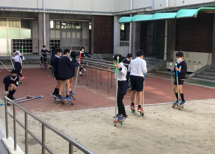 竹馬は休み時間に人気の道具となり、中庭では、写真のような光景が見られます。