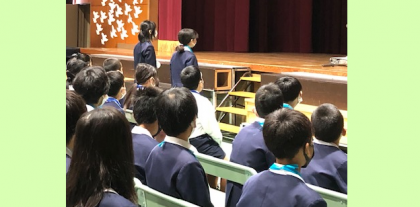 在校生からの贈り物にこたえる6年生は、音楽に合わせてリズム演奏です。