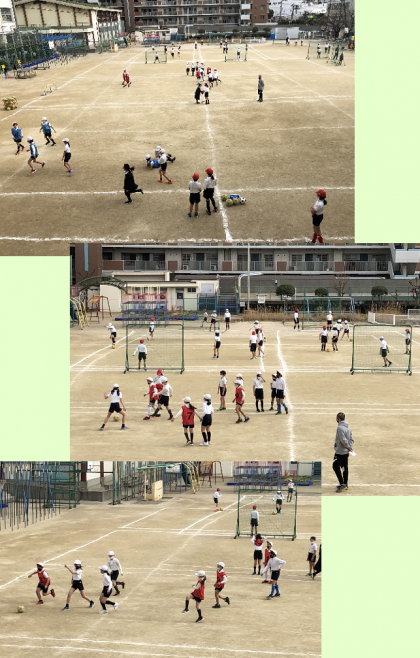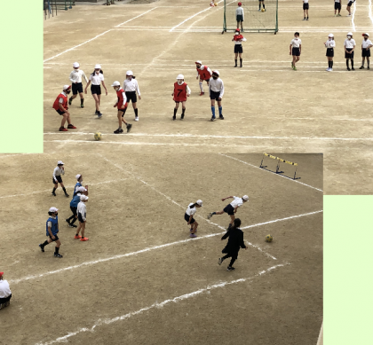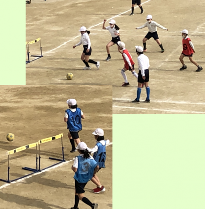 コートの端にハードルを2台、ゴールに見立てて立ています。子どもたちは、そこに蹴りこもうと、懸命にボールを追いかけていました。