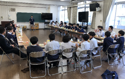 多目的室でコの字型に机を設え、卒業までのいろいろな思いを胸に、お楽しみ会の始まりです。