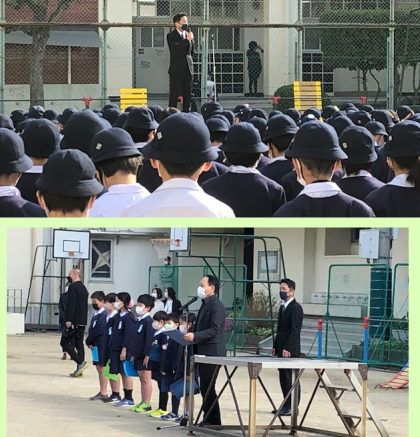 雨上がりの朝になりました。少しぬかるみの残る運動場に全校児童が集まり今年度の締めくくり、修了式を行いました。